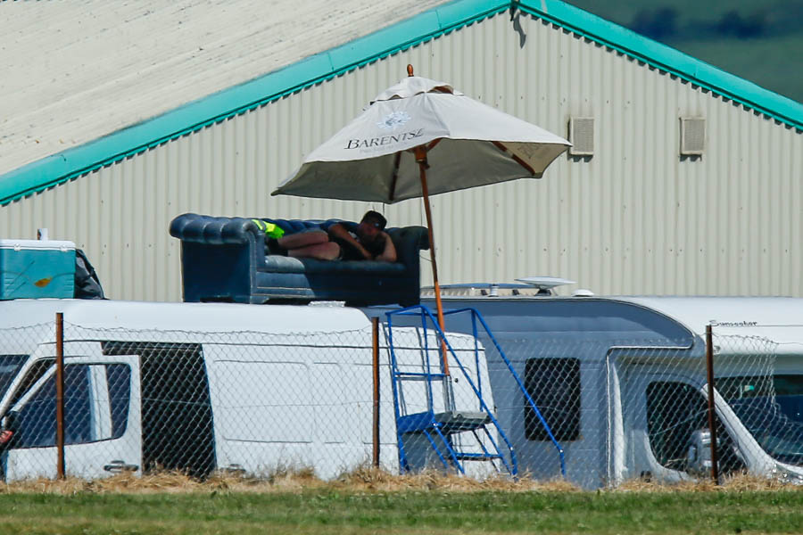 Must say that this fan had the right idea, major props to him for not only going to the trouble of a nice leather armchair and parasol but also a decent set of steps to get to it.